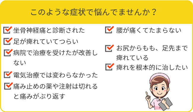 おばら整骨院・整体院は、坐骨神経痛でお困りの方に特化した懇切丁寧な治療を行なっております。