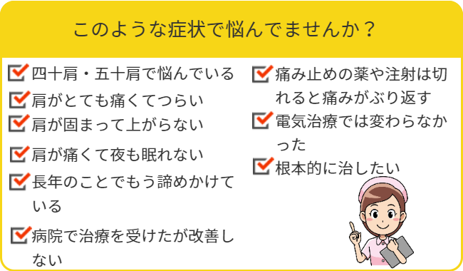 的確な身体検査と県内唯一の施術技術を使って四十肩・五十肩に特化した施術を施します!