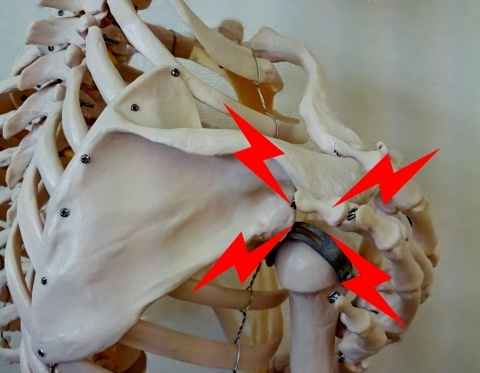 本来動くべき肩甲骨が動かないことにより肩関節が通常よりもたくさん動かさなければならず、関節に負担がかかり痛みが生じます。