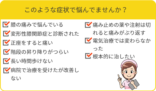 おばら整骨院・整体院は、膝の痛みでお困りの方に特化した懇切丁寧な治療を行なっております。